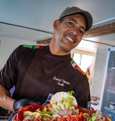 2. Técnica Profissional de Sushi Fusion Aulas práticas intensivas, onde você aprende: • cortes profissionais de peixe • preparo correto do arroz • montagem de sushis, sashimis e rolls premium • criação de molhos e acompanhamentos • combinações criativas unindo Japão + Portugal+Italia+Brasil + Bahia